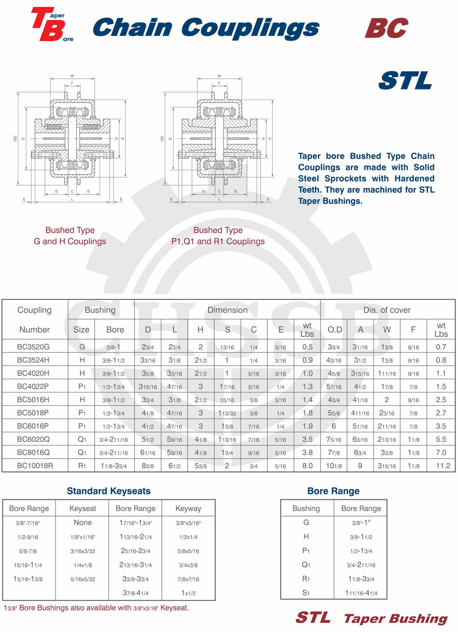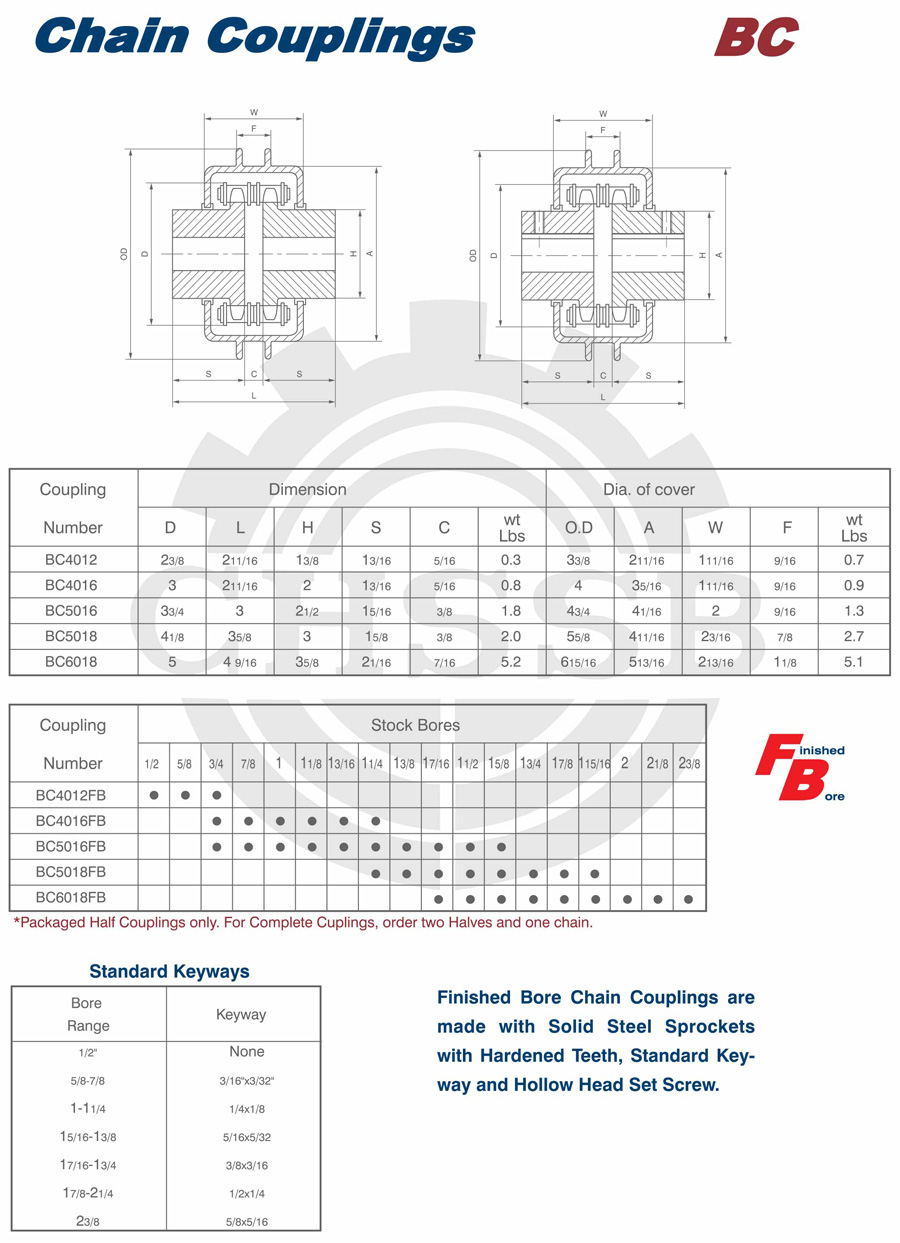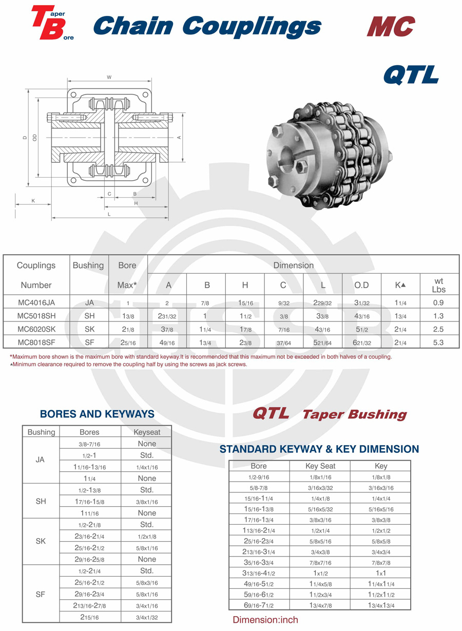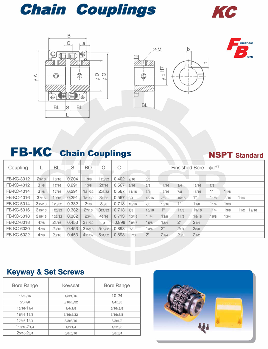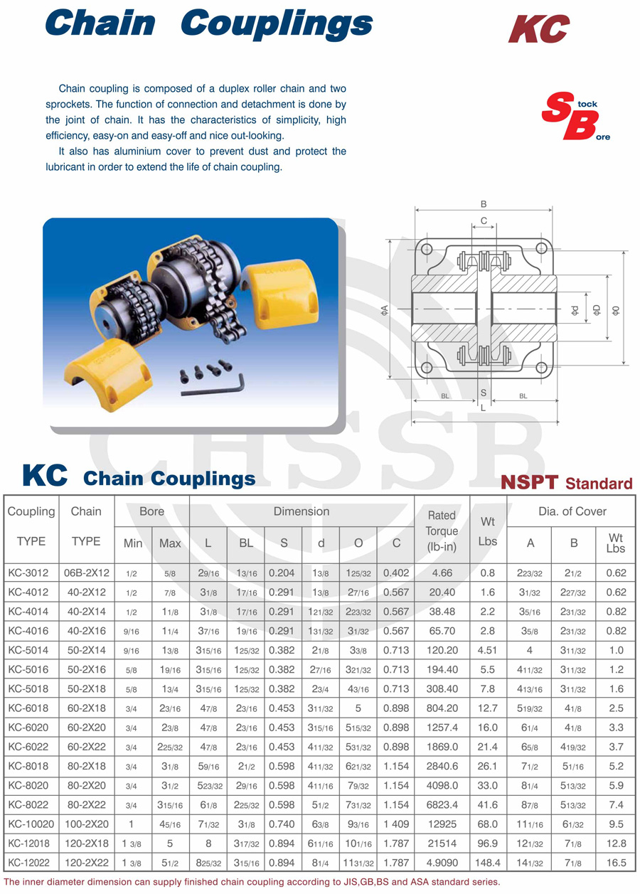 Range of product: ANSI:(SB-KC/FB-KC/FB-MC/BTL-MC/QTL-MC/FB-BC/STL-BC) DIN:(KC) Inch size product (Apply to ANSI market) Metric size product (Apply to DIN market) KC Chain Couplings